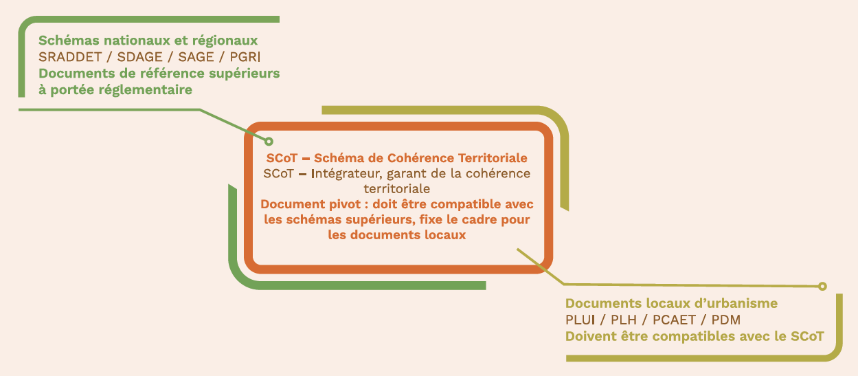 S’appliquant à l’échelle du bassin de vie, le SCoT représente un document pivot pour l’ensemble du territoire garantissant l’intégration, la cohérence et la compatibilité des plans et politiques à l’échelle intercommunale, actuels et à venir, tout en traduisant la vision stratégique locale dans le cadre des grandes politiques nationales et régionales.